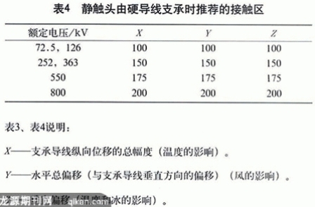 單柱垂直斷口隔離開關(guān),因其靜觸頭懸掛在母線上,為了適應(yīng)風(fēng)力、溫度和冰雪的影響,確保隔離開關(guān)能可靠合閘,GB1985對接觸區(qū)(也稱鉗夾范圍)提出了推薦值,如表3、表4。在進(jìn)行變電站設(shè)計(jì)和選用隔離開關(guān)時(shí),應(yīng)考慮到具體運(yùn)行條件,確保靜觸頭處在規(guī)定的接觸區(qū)限值之內(nèi),使隔離開關(guān)能正確地分合閘。