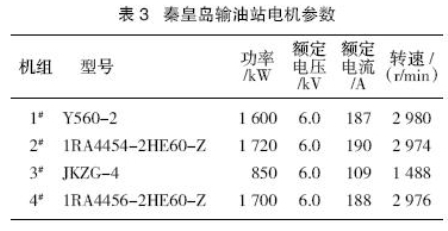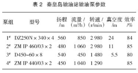 秦皇島輸油站輸油設備如表2、表3所列。秦皇島輸油站配備4臺輸油泵機組,并聯方式,直接抽10萬m3油罐外輸,且只能一臺泵機組運行。其中1#泵機組配有液力耦合器調速裝置,其它3臺均無調速裝置。冀東原油混入后,出現1#、2#、4#泵機組配置明顯偏大,而3#泵機組配置又有所偏低的狀況,致使輸油站外輸量降低。目前運行中以帶液力耦合器的1#輸油泵機作為主力,該泵機組為上世紀90年代初期國產產品,效率低,故障率高;而于2003 年與2004年相繼更換的2#、4#泵機組(進口設備)因揚程、排量過大,目前基本處于閑置狀態。