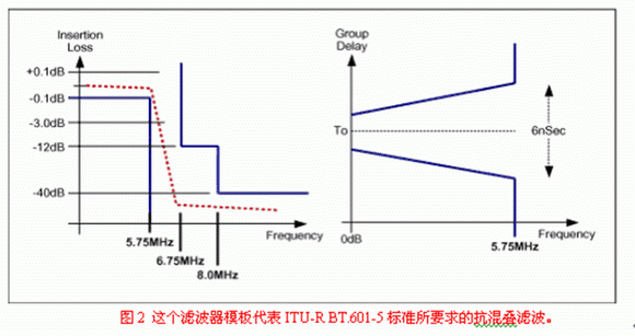 對于抗混疊濾波器,選擇性由ITU-601規定的模板來確定,就像圖2中所顯示的。帶寬規定為5.75MHz ( 0.1dB,插損在6.75MHz處為12dB,8MHz處為40dB,0.1dB帶寬范圍內群延時差異為(3ns。這樣的性能要求對于單純的模擬濾波器來講太困難了,但是通過四倍過采樣可以將該要求調整為27MHz處12dB,32MHz處40dB。