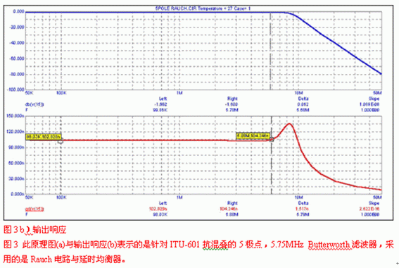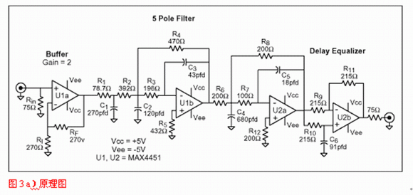 使用軟件或歸一化曲線,我們會發現-3dB帶寬為8.45MHz的5極點Butterworth濾波器就能滿足選擇性要求,但沒考慮群延時。對于后者,需要一個延時級,對于此電路,需要重點關注的運放參數為0.1dB,2VP-P帶寬。將該數值應用于式1和2可獲得精確的設計。圖3a與3b給出了一個適合此類應用的原理圖,并用曲線顯示了它的增益和群延時特性,此設計基于四倍過采樣系統。由于MAX4450/4451卓越的瞬態響應與大信號帶寬(2VP-P時175MHz),因此選擇它。