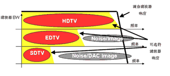 上述情況對接受 Y’P’BP’R或G’B’R’分量視頻信號的接收機系統來說尤為重要。舉例來說,如果我們用固定的35MHz無源濾波器為顯示器提供所有分量信號,那么在輸入端采用480i或576i SD分量信號怎么辦呢?一般的 DAC 對這種信號的采樣頻率為27MHz。如果DAC不帶重構濾波器的話,那么27MHz基本頻率兩側出現的圖像將直接通過顯示器的無源35MHz濾波器,造成圖像未經衰減,因此顯示器上顯示的畫質通常非常差。