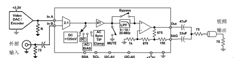 如果系統設計中已經采用了THS7303或THS7313 6dB增益放大器,并采用了參考接地的DAC或編碼器驅動,那么DC輸入模式會很理想。問題在于,DAC生成的電壓有多低?如果同步信號(通常這是視頻信號中電壓最低的)電壓低于50mV,那么6dB放大器的輸出就應生成低于100mV的電壓,由于CMOS和雙極放大器都存在晶體管飽和方面的限制,因此這對任何放大器來說都是很難做到的。