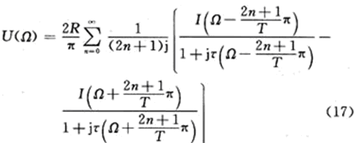 上式說明,Ie(Ω)是輸入電流頻譜I(Ω)周期延拓的組合,周期為Ω0=2π/T。各電流分量流過RC并聯支路時的電壓為相應電流分量與RC支路阻抗(R/(1+jωτ),ω=Ω±(2n+1)π/T)的乘積,于是輸出電壓頻譜U(Ω)為:
