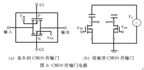 基本的CMOS傳輸門如圖6(a)所示。當(dāng)傳輸門導(dǎo)通時,在輸入與輸出之間呈現(xiàn)低電阻,它允許電流向兩個方向中的任一方向流經(jīng)此門。此時,輸入線的電壓必須比N溝器件的襯底電壓(VSS)為正,比P溝器件的襯底電壓(VDD)為負(fù)。這導(dǎo)致了傳統(tǒng)的CMOS傳輸門和以此為基礎(chǔ)構(gòu)成的CMOS模擬開關(guān)難以適應(yīng)大信號的傳輸[4~5]。