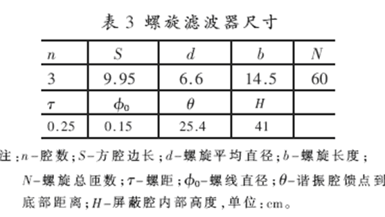 調(diào)頻范圍1.5M~3MHz;通帶中心插耗A0≤3dB;25dB帶寬△f25dB≥25kHz; 終端負(fù)載RS=RL=50Ω;傳輸功率P=100W。采用等元型螺旋濾波器設(shè)計法[6]確定的方腔螺旋腔濾波器腔數(shù)及尺寸見表3,測試結(jié)果見圖9、10及表4。
