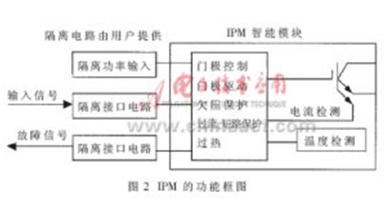 IPM的功能框圖如圖2所示。IPM內(nèi)置驅(qū)動(dòng)和保護(hù)電路,隔離接口電路需用戶自己設(shè)計(jì)。