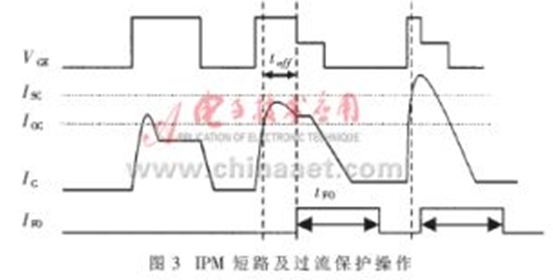 ,大多數(shù)IPM采用兩級(jí)關(guān)斷模式,過流保護(hù)和短路保護(hù)操作可參見圖3。其中,VG為內(nèi)部門極驅(qū)動(dòng)電壓,ISC為短路電流值,IOC為過流電流值,IC為集電極電流,IFO為故障輸出電流。