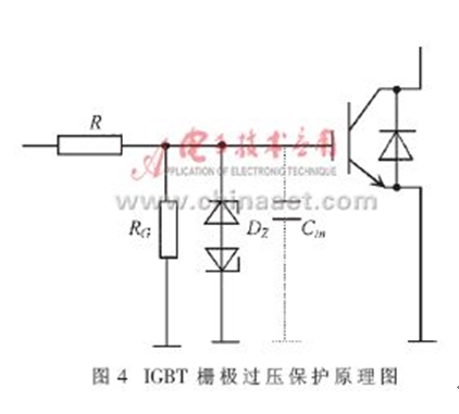 IGBT的驅(qū)動(dòng)設(shè)計(jì)問題亦即MOSFET的驅(qū)動(dòng)設(shè)計(jì)問題;設(shè)計(jì)時(shí)應(yīng)注意以下幾點(diǎn):①IGBT柵極耐壓一般在±20V左右,因此驅(qū)動(dòng)電路輸出端要給柵極加電壓保護(hù),通常的做法是在柵極并聯(lián)穩(wěn)壓二極管或者電阻。前者的缺陷是將增加等效輸入電容Cin,從而影響開關(guān)速度,后者的缺陷是將減小輸入阻抗,增大驅(qū)動(dòng)電流,使用時(shí)應(yīng)根據(jù)需要取舍。圖4為IGBT柵極保護(hù)原理圖,其中,RG、DZ、Cin分別為等效柵極阻抗、穩(wěn)壓管和等效輸入電容。②盡管IGBT所需驅(qū)動(dòng)功率很小,但由于MOSFET存在輸入電容Cin,開關(guān)過程中需要對(duì)電容充放電,因此驅(qū)動(dòng)電路的輸出電流應(yīng)足夠大,這一點(diǎn)設(shè)計(jì)者往往忽略。假定開通驅(qū)動(dòng)時(shí),在上升時(shí)間tr內(nèi)線性地對(duì)MOSFET輸入電容Cin充電,則驅(qū)動(dòng)電流為