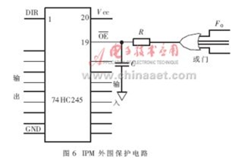 方案一 PWM接口電路前置74HC245、74HC244等帶控制端的三態(tài)收發(fā)器,如圖6所示。IPM的控制信號(hào)經(jīng)過74HC245的輸入、74HC245的輸出后送至IPM接口電路;各個(gè)IPM的故障輸出信號(hào)經(jīng)光耦隔離輸出后得到高電平FO,送入或門,或門輸出經(jīng)過R-C低通濾波器后,送入74HC245的使能端/OE。IPM正常工作時(shí),或門輸出為低電平,74HC245選通;IPM故障報(bào)警時(shí),或門輸出為高電平,74HC245所有輸出置為高阻,封鎖各個(gè)IPM的控制信號(hào),關(guān)斷IPM;實(shí)現(xiàn)了保護(hù)功能。