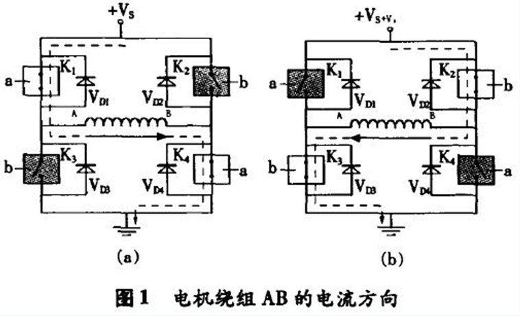 4個開關K1和K4,K2和K3分別受控制信號a,b的控制,當控制信號使開關K1,K4合上,K2,K3斷開時,電流在線圈中的流向如圖1(a),當控制信號使開關K2,K3合上,K1,K4斷開時,電流在線圈中的流向如圖1(b)所示。4個二極管VD1,VD2,VD3,VD4為續流二極管,它們所起的作用是:以圖1(a)為例,當K1,K4開關受控制由閉合轉向斷開時,由于此時線圈繞組AB上的電流不能突變,仍需按原電流方向流動(即A→B),此時由VD3,VD2來提供回路。因此,電流在K1,K4關斷的瞬間由地→VD3→線圈繞組AB→VD2→電源+Vs形成續流回路。同理,在圖1(b)中,當開關K2,K3關斷的瞬間,由二極管VD4,VD1提供線圈繞組的續流,電流回路為地→VD4→線圈繞組BA→VD1→電源+Vs。步進電機驅動器中,實現上述開關功能的