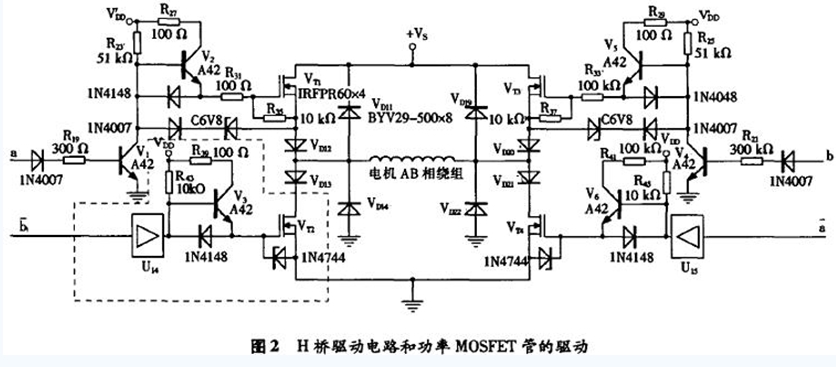 功率MOSFET管有內接的快恢復二極管。當不接VD11,VD12,VD13,VD14時,假定此時電機AB相繞組由VT1管(和VT4管)驅動,即VT2管(和VB)截止,VT1管(和VT4管)導通,電流經VT1管流過繞組。當下一個控制信號使VT1管關斷時,負載繞組的續流電流經VT2的內接快恢復二極管從地獲取。此時,VT2管的漏源電壓即是該快恢復二極管的通態壓降,為一很小的負值。當VT1再次導通時,該快恢復二極管關斷,VT2的漏源電壓迅速上升,直至接近于正電源的電壓+VS,這意味著VT2漏源間要承受很高且邊沿很陡的上升電壓,該上升電壓反向加在VT2管內的快恢復二極管兩端,會使快恢復二極管出現恢復效應,即有一個很大的電流流過加有反向電壓的快恢復二極管。為了抑制VT2管內的快恢復二極管出現這種反向恢復效應,在圖2電路中接人了VD11,VD12,VD13,VD14。其中,反并聯快恢復二極管VD11,VD14的作用是為電機AB相繞組提供續流通路,VD12,VD13是為了使功率MOSFET管VT1,VT2內部的快恢復二極管不流過反向電流,以保證VT1,VT2在動態工作時能起正常的開關作用。VD19,VD20,VD21,VD22的作用亦是同樣的道理。