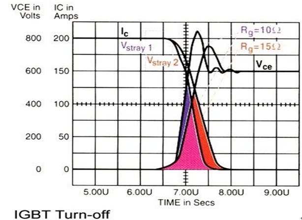 每個IGBT開關特性的設定可受外部電阻RG的影響。由于IGBT的輸入電容在開關期間是變化的,必須被充放電,柵極電阻通過限制導通和關斷期間柵極電流(IG)脈沖的幅值來決定充放電多長時間(見圖1)。由于柵極峰值電流的增加,導通和關斷的時間將會縮短且開關損耗也將會減少。減小RG(on)和RG(off)的阻值會增大柵極峰值電流。當減小柵極電阻的阻值時,需要考慮的是當大電流被過快地切換時所產生的電流隨時間變化特性di/dt。電路中存在雜散電感在IGBT上產生大的電壓尖峰。這一效果可在圖2所示的IGBT關斷時波形圖中觀察到。圖中的陰影部分顯示了關斷損耗的相對值。集電極-發射極電壓上的瞬間電壓尖峰可能會損壞IGBT,特別是在短路關斷操作的情況下,因為di/dt比較大。可通過增加柵極電阻的值來減小Vstray。因此,消除了由于過電壓而帶來的IGBT被損毀的風險。快速的導通和關斷會分別帶來較高的dv/dt和di/dt,因此會產生更多的電磁干擾(EMI),從而可能導致電路故障。表1顯示不同的柵極電阻值對di/dt的影響。