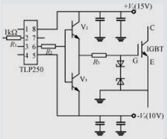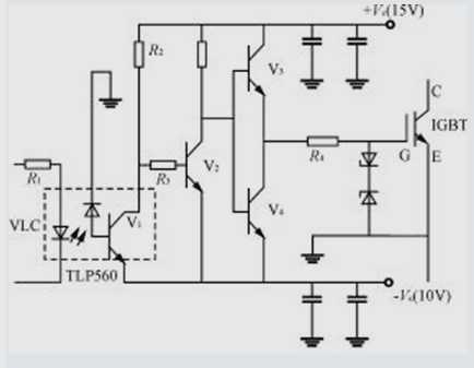 圖3為采用光耦合器等分立元器件構成的IGBT驅動電路。當輸入控制信號時,光耦VLC導通,晶體管V2截止,V3導通輸出+15V驅動電壓。當輸入控制信號為零時,VLC截止,V2、V4導通,輸出-10V電壓。+15V和-10V電源需靠近驅動電路,驅動電路輸出端及電源地端至IGBT柵極和發射極的引線應采用雙絞線,長度最好不超過0.5m。