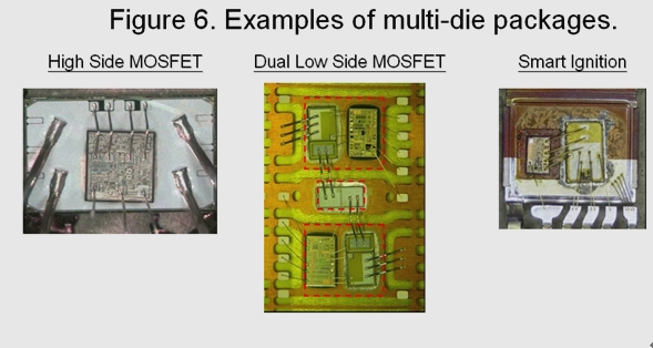 圖6所示為目前車載系統中采用多芯片封裝的幾個實例。這些智能化器件可以提供更高的系統性能監控能力,通過集成保護功能提高功率系統的可靠性。如過流、過壓和過熱保護等功能都是這類產品的標配。當器件感測到有可能發生上述異常狀況時,能夠把功率MOSFET置于自我保護整個系統的環境中。此外,這些器件還集成有附加診斷功能,用以監控負載開路或短路,有助于指導汽車機械裝置隔離和糾正車輛中出現的問題。