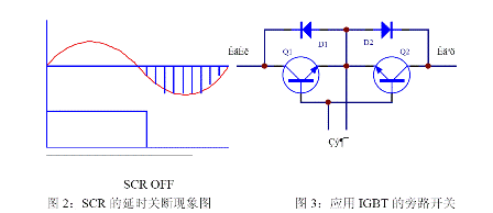 旁路開關常使用繼電器和可控硅。繼電器在中小功率的UPS 中廣泛應用。優點是控制簡單,成本低,缺點是繼電器有轉換時間,還有就是機電器件的壽命問題。可控硅常見于中大功率UPS 中。優點是控制電流大,沒有切換時間。但缺點就是控制復雜,且由于可控硅的觸發工作特性,在觸發導通后要在反向偏置后才能關斷,這樣就會產生一個最大10ms 的環流電流,如圖2。如果采用IGBT,如圖3,則可以避免這個問題,使用IGBT 有控制簡單的優點,但成本較高。其工作原理為:當輸入為正半周時,電流流經Q1、D2,負半周時電流流經D1、Q2。