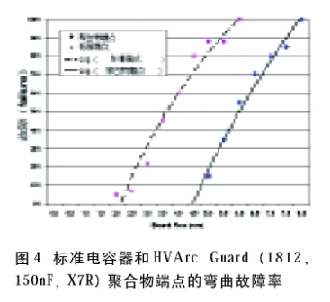 如同在前一部分中提到的那樣,焊接引線和涂層已廣泛用于生產(chǎn)高壓元件。除了引線外,引線框也可以用來封裝多個電容器,以得到更高的容量和增加符合性。盡管增加一個鷗翼型引線框會顯著增加元件的成本,但是它可以避免電路板彎曲的發(fā)生。直到最近,都沒有有效的方法來增加表面貼裝器件端點(diǎn)的符合性,但這個歷史已經(jīng)一去不復(fù)返了。通過在環(huán)氧聚合物端點(diǎn)上加上銀,可以防止電路板彎曲時發(fā)生的故障,進(jìn)而增加可靠性。這種選擇目前已用于我們的OMD-Cap范圍高壓系列設(shè)計以及HVArc Guard電容器。當(dāng)電路板彎曲時,標(biāo)準(zhǔn)電容器與相同HVArc Guard電容器的聚合物端點(diǎn)的測試顯示的故障率差異如圖4所示。
