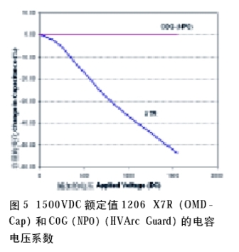 高壓電容器通常是采用X 7 R 和C0G 電解質(zhì)制造的。這些名稱描述了在-55~+125℃溫度系數(shù)將分別為美國電子工業(yè)協(xié)會(EIA)的±15%和±30×10-6/℃。C0G電容器也可以用更常用的術(shù)語表示,即NP0(正負(fù)零)。不過,值得注意的是,在1kHz條件下以1Vrms進(jìn)行電容測量非常重要,各種材料可以用這些名稱來描述。對許多電源應(yīng)用來說,重要的是知道在某個具體電壓下的電容容量。X7R和C0G(NP0)電容器之間存在顯著的差異;施加了DC電壓的X7R電容器將釋放出大量容量,而C0G(NP0)電容仍然沒有太大的變化。出現(xiàn)這種現(xiàn)象是由于與C0G(NP0)電解質(zhì)的鐵電性質(zhì)相比,鐵電X 7 R 材料在剩余極化(remnant polarization)方面有根本的不同。實(shí)際上,雖然X7R MLCC具有高得多的容量,但是其容量在施加DC電壓時會顯著下降。這方面的一個例子如圖5所示。因此,當(dāng)采用多層電容器時,設(shè)計人員必須考慮到施加電壓下的可用容量。