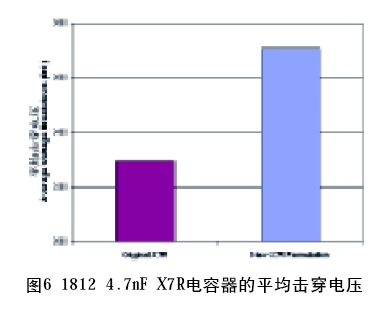 如前面敘述的那樣,有許多材料可以滿足X7R或C0G(NP0)的這類TCC要求。這些材料與各種設(shè)計的組合并不能在施加的DC電壓下以完全相同的方式實(shí)現(xiàn)。不同制造商任何給定電壓的可用容量一定會有很大的差異。較高的電壓可以與X 7 R 電解質(zhì)中的鐵電疇(ferroelectric domain)相耦合,在元件上產(chǎn)生一種機(jī)械應(yīng)力。這種“壓電應(yīng)力”會導(dǎo)致電容器在z方向上若干微米的移動。當(dāng)然,這是根據(jù)壓電執(zhí)行器的原理,但是在MLCC的情況下,連續(xù)的電壓尖峰會導(dǎo)致應(yīng)力裂紋和故障。為了解決這個問題,應(yīng)該使用這種具有降低壓電耦合能力的2000VDC 以上額定值的X7R電解質(zhì)電容器。降低耦合系數(shù)的影響可以增加擊穿耐壓,如圖6所示。這些設(shè)計采用了完全相同的有效厚度和“浮動電極”型設(shè)計。唯一的差異在于X7R電解質(zhì)的新制劑方面的修改,它可以減少與施加電壓的耦合。這種新制劑已用于我們的高壓OMD-Cap產(chǎn)品線。