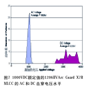 在許多應(yīng)用中,AC電源處理以及承受AC電壓的能力至關(guān)重要。測量這種能力的一種典型方法是在各種高頻條件下施加AC紋波電壓,直到電容器增加到超過環(huán)境溫度20℃以上。不過,在X7R電容器與C0G(NP0)的電容器之間又一次出現(xiàn)了顯著的差異,前者的剩余電偶(remnant dipole)隨著施加的電場移動而引起發(fā)熱,而后者在這種情況下的溫度不會增加。另一個AC 能力指標(biāo)是通過施加60Hz AC電壓,將其提升至6kV峰值30s 以上,直到發(fā)生電解質(zhì)擊穿而實(shí)現(xiàn)的。這種類型測試的結(jié)果可以與對1000VDC額定值的1206 X7R HVArc Guard電容器施加500Vdc/s的破壞測試的DC擊穿電壓相比,如圖7所示。D C 電壓故障的發(fā)生遠(yuǎn)遠(yuǎn)超過了1000VDC額定值。由于AC電壓故障發(fā)生在1000VAC左右,與DC電壓相比,故障的分布范圍很窄。