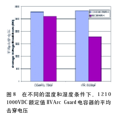如前面提到的那樣,電容器或電路板涂層可以防止表面弧,而且還可以作為一種防潮的屏障。為了測試HVArc Guard元件對由濕度引起的故障的易感性,對1210外殼尺寸、1000VDC額定值的MLCC樣品進(jìn)行了擊穿電壓測試,其環(huán)境條件為23.8℃/53.3%RH,提高的溫濕度為85℃/85%RH。其結(jié)果如圖8所示。盡管在85/85條件下X7R的平均擊穿電壓相當(dāng)?shù)停獵0G(NP0)幾乎不受影響。因此,C0G(NP0)看似不那么易受潮濕所引起故障的影響,而兩種情況的擊穿都是在容許范圍以內(nèi),即使是在高濕度條件下。兩種環(huán)境條件下測試的元件擊穿范圍均高于額定電壓。