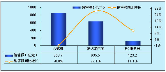 等行業對IT集中采購出現延后,部分中小企業資金也出現問題,采購有所停滯,不過,相比較其他IT硬件產品而言,筆記本電腦受影響程度相對較小,增速繼續領跑。據賽迪顧問統計,2008年,中國筆記本市場銷售量為901.8萬臺,同比增長43.2%,銷售額達到635.5億元,同比增長為27.1%。
