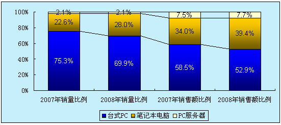 2009年中國IT市場年會上賽迪顧問發布的最新研究成果顯示,2008年,包括臺式PC、筆記本電腦和PC服務器在內的PCs市場銷量達到3218.5萬臺,同比增長15.2%,銷售額為1612.4億元,同比增長9.6%,增速相比上一年都有較大的下滑。其中,臺式PC與預期相比下降最大。