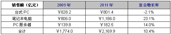 表1 2009-2011年中國PCs市場銷售額預測