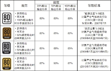 表1:80 PLUS等能效標準對多路輸出ATX電源的能效要求