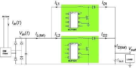 兩個DCM PFC就像一個CCM PFC轉換器,簡化電磁干擾(EMI)濾波,并減小輸入電流有效值