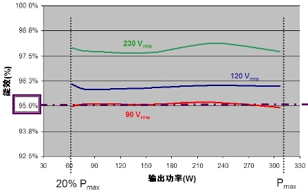 對基于安森美半導體NCP1601交錯式PFC方案的寬輸入范圍、300 W PFC預轉換器進行的測試顯示,這解決方案在很寬的負載范圍內(從20%到100%)、90 Vrms電壓條件下實現95%的能效,如圖2所示。