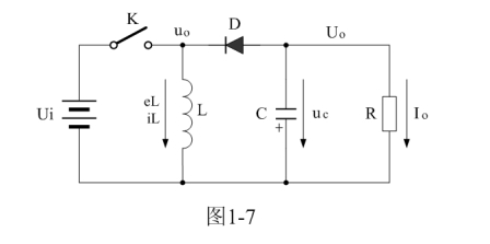 圖1-7中,Ui為輸入電源,K為控制開關(guān),L為儲能電感,D為整流二極管,C為儲能濾波電容,R為負(fù)載電阻。當(dāng)控制開關(guān)K接通的時候,輸入電源Ui開始對儲能電感L加電,流過儲能電感L的電流開始增加,同時電流在儲能電感中也要產(chǎn)生磁場;當(dāng)控制開關(guān)K由接通轉(zhuǎn)為關(guān)斷的時候,儲能電感會產(chǎn)生反電動勢,使電流繼續(xù)流動,并通過整流二極管D進(jìn)行整流,再經(jīng)電容儲能濾波,然后向負(fù)載R提供電流輸出。控制開關(guān)K不斷地反復(fù)接通和關(guān)斷過程,在負(fù)載R上就可以得到一個負(fù)極性的電壓輸出。