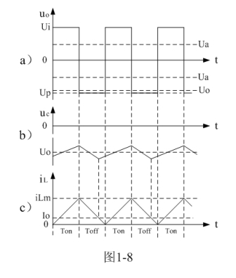 圖1-8、圖1-9、圖1-10分別是控制開關(guān)K的占空比D等于0.5、< 0.5、> 0.5時,圖1-7電路中幾個關(guān)鍵點(diǎn)的電壓和電流波形。圖1-8-a)、圖1-9-a)、圖1-10-a)分別為控制開關(guān)K輸出電壓uo的波形;圖1-8-b)、圖1-9-b)、圖1-10-b)分別為儲能濾波電容兩端電壓uc的波形;圖1-8-c)、圖1-9-c)、圖1-10-c)分別為流過儲能電感L電流iL的波形。應(yīng)該特別注意的是,圖1-8-c)、圖1-9-c)、圖1-10-c)中的電流波形按原理應(yīng)該取負(fù)值,但取負(fù)值后與前面圖1-5與圖1-6對比反而覺得不好對比和分析,因此,當(dāng)進(jìn)行具體計(jì)算時,一定要注意電流和電壓的方向。[page]