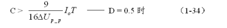 (1-33)和(1-34)式,就是計(jì)算反轉(zhuǎn)式串聯(lián)開關(guān)電源儲能濾波電容的公式(D = 0.5時)。式中:Io是流過負(fù)載電流的平均值,T為開關(guān)工作周期,ΔUP-P為濾波輸出電壓的波紋,或電壓紋波。一般波紋電壓都是取電壓增量的峰-峰值,因此,當(dāng)D = 0.5時,波紋電壓等于電容器充電的電壓增量,即:ΔUP-P = 2ΔUc 。