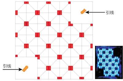 AC LED光源的重大技術(shù)突破是超細(xì)LED晶粒在封裝時(shí)的特殊排列組合技術(shù),同時(shí)利用LED PN結(jié)的二極管特性兼作整流,半導(dǎo)體制程在其中扮演著相當(dāng)重要的角色。AC LED通過半導(dǎo)體制程整合成一堆微小晶粒,采用交錯(cuò)的矩陣式排列工藝,并加入橋式電路至芯片設(shè)計(jì),使AC電流可雙向?qū)ǎ瑢?shí)現(xiàn)發(fā)光。晶粒的排列如圖2所示,左圖是AC LED晶粒采用交錯(cuò)的矩陣式排列示意圖,右小圖是實(shí)際AC LED晶粒排列照片,AC LED晶粒在接上交流后通體發(fā)光,因此只需要二根引線導(dǎo)入交流源即能發(fā)光工作。