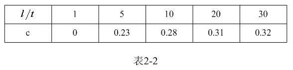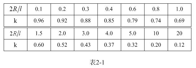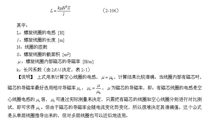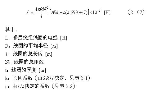 【說明】上式是用來計算多層線圈繞組、截面為圓形的空心線圈的電感計算公式。長岡系數k可查閱表2-1,系數c可查閱表2-2。當線圈內部有磁芯時,有磁芯線圈的電感是空心線圈電感的 倍, 是磁芯的相對導磁率。相對導磁率的測試方法很簡單,只需把有磁芯的線圈和空心線圈分別進行測試,通過對比即可求出相對導磁率的大小。