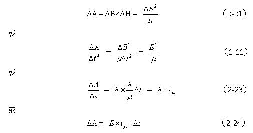 在圖2-12中,ΔA是在變壓器鐵芯磁滯回線中任意取出來進行分析的面積,ΔA面積的取值可以任意的小,以保證在此面積中變壓器鐵芯的導磁率可以看成是一個常數。與ΔA面積對應的有磁感應強度增量ΔB和磁場強度增量ΔH以及時間增量Δt。根據磁場強度、磁通密度的定義,以及電磁感應的定理,可以列出下面關系試關系式: