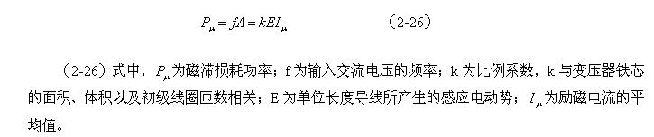 (2-25)式中,A為一個周期內變壓器鐵芯的磁滯損耗,單位是焦耳;E為單位長度導線所產生的感應電動勢,單位為伏; 為勵磁電流的平均值,單位為安培;T為輸入交流電壓的周期,單位為秒,f為脈沖頻率,或開關電源的工作頻率,單位為赫芝;k為比例系數,它是一個與選用單位制和變壓器鐵芯面積、體積以及初級線圈匝數等參數相關的常量。在(2-21)、(2-22)、(2-23)、(2-24)式中,沒有比例系數k,是為了使問題簡單,便于分析。