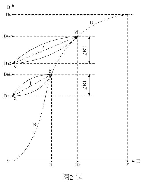 在圖2-14中,虛線B或0-B-B為變壓器鐵芯的初始磁化曲線;當輸入直流脈沖的幅度比較低,或脈沖寬度比較窄時,磁通密度由Br1沿著磁化曲線a-b上升,到達Bm1后脈沖結束,然后磁通密度由Bm1沿著磁化曲線b-a下降回到Br1,虛線1是其等效磁化曲線。