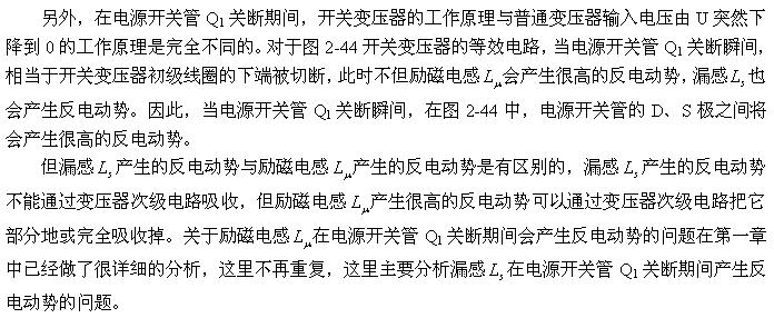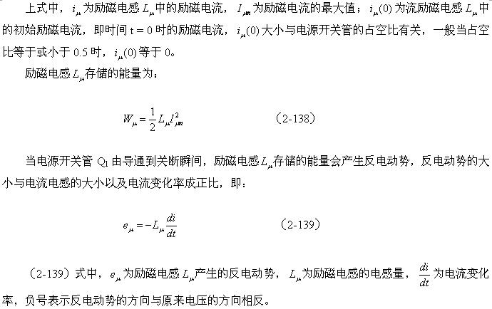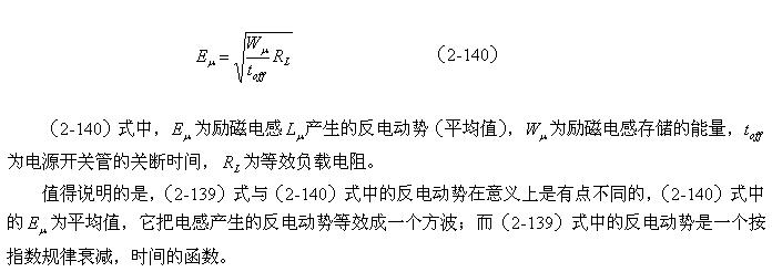 (2-140)式對于計(jì)算漏感 產(chǎn)生的反電動(dòng)勢或其它電感產(chǎn)生的反電動(dòng)勢同樣有效。漏感 中存儲(chǔ)的能量可根據(jù)(2-138)式求得;而流過漏感 的電流,對于反激式開關(guān)電源:可認(rèn)為與勵(lì)磁電流的大小基本相等,因?yàn)椋诜醇な介_關(guān)電源中,等效負(fù)載電阻等于無限大;對于正激式開關(guān)電源:可認(rèn)為與流過等效負(fù)載電阻的電流大小基本相等,因?yàn)椋谡な介_關(guān)電源中,勵(lì)磁電流相對于流過等效負(fù)載電阻的電流,很小。