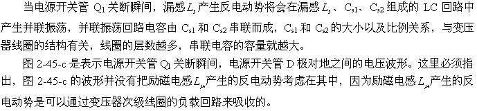 圖2-47中的D1、R1、C1是抑制漏感以及勵(lì)磁電感產(chǎn)生反電動(dòng)勢和振鈴電壓幅度的有效電路。當(dāng)變壓器初級(jí)漏感以及勵(lì)磁電感產(chǎn)生反電動(dòng)勢時(shí),反電動(dòng)勢通過二極管D1對電容器C1進(jìn)行充電,相當(dāng)于電容器把反電動(dòng)勢的能量吸收掉,從而降低了反電動(dòng)勢和振鈴電壓的幅度。