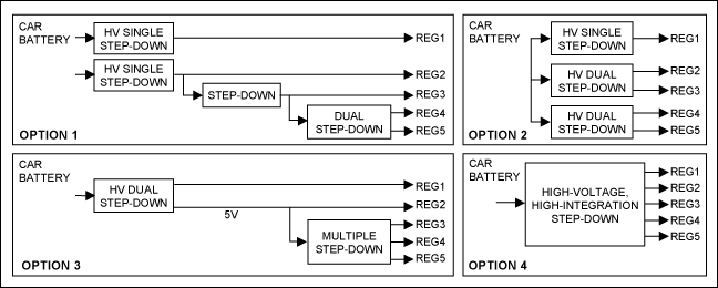 有助于合理利用開關(guān)電源/線性穩(wěn)壓器。例如,如果系統(tǒng)中提供為處理器供電的3.3V電源,相對于直接從汽車電池降壓到1.8V,從3.3V電壓產(chǎn)生1.8V300mA的電源效率更高、成本也更低。如果新設(shè)計中需要更改電源電壓,舊的電源模塊不再滿足要求時,設(shè)計人員可以很容易地選擇一個替代模塊,不會造成任何浪費。