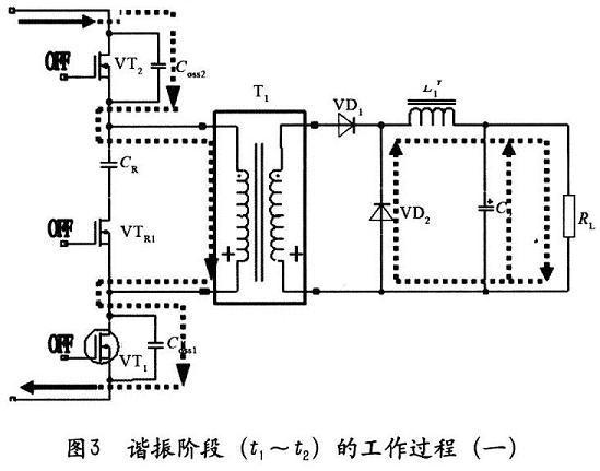 2)諧振階段(t1~t2),如圖3所示,在占空比的控制下,第一主開關管VT1和第二主開關管VT2在t1時刻同時關斷,變壓器磁芯極性反轉。因輸入電源和變壓器的勵磁電感的作用給VT1和VT2的寄生電容COSS1,COSS2充電,由于電容電壓不能突變,第一主開關管VT1和第二主開關管VT2在ZVS狀態下關斷。同時變壓器的勵磁電流開始給鉗位開關管VTR1的寄生電容COSS放電,經VTR1的體二極管給鉗位電容CR1充電。次級VD1截止,VD2導通,L1經過VD2續流繼續給負載RL供電。