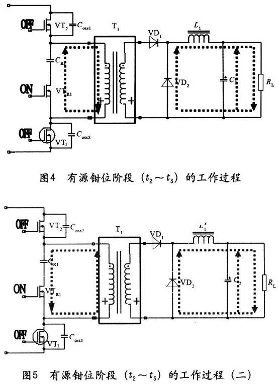 3)有源鉗位階段(t2~t3),如圖4和圖5所示,在亡2時刻鉗位開關管VTR在ZVS狀態下開啟,由于VTR1的體二極管先前已開通,VTRl的UDS電壓很低。鉗位開關管VTR1在整個階段處于開通狀態,變壓器勵磁電流經過鉗位開關管VTR1繼續給鉗位電容CR1充電,鉗位電容CR1充滿以后經變壓器勵磁電感放電。次級在整個階段由L1續流經VD2給負載供電,VD1截止。
