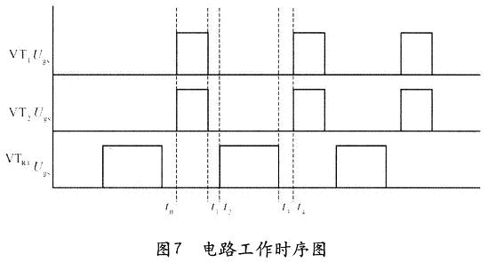 4)諧振階段(t2~t4),如圖6所示,t3時刻鉗位開關管VTR1在ZVS狀態下關斷(VTR1的寄生電容使電壓不能突變),由于變壓器初級電流仍然反向流動,磁芯極性反轉,使第一主開關管VT1和第二主開關管VT2的寄生電容COSS放電,在t3后VD1導通,VD2截止;然后其主開關管的體二極管導通把能量全部送回輸入電源與負載,變壓器磁芯完成磁復位。此時主開關管VT1和VT2的UDS電壓為零,t4時刻同時開啟第一主開關管VT1和第二主開關管VT2做到ZVS導通。在t4完成后,開關周期又返回到t0~t1的狀態。