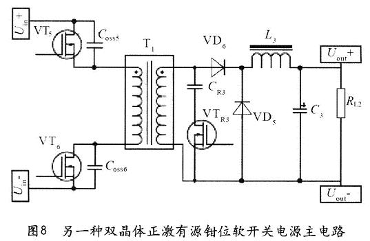 雙晶正激有源鉗位軟開關電源還有另一種結構,如圖8所示。其結構與圖1所示的雙晶正激有源鉗位軟開關電源基本相似,只鉗位開關管VTR3以及鉗位電容CR3設置在副邊,鉗位電容CR3一端與變壓器的同名端相連,另一端與鉗位開關管VTR3的D極相連,鉗位開關管VTR3的S極與變壓器的異名端相連,請參閱圖8。其工作原理同在初級鉗位相差不多,這里不再講述。