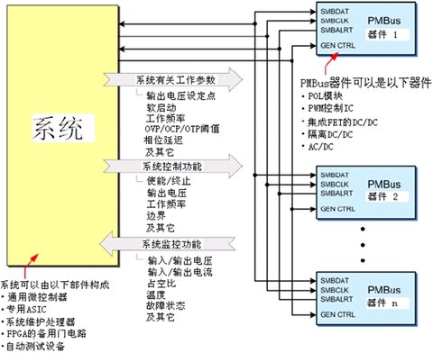 PMBus是屬于系統管理實施論壇(SystemImplementersForum:SM-IF)的一個開放性標準,用于定義功率集成電路,所有類型的功率變換電路(例如AC/DC,隔離的DC/DC,非隔離的點負載(POL)變換器和微處理器供電的變換器等)之間相互通信的一種開放性通信協議。
