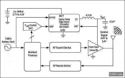 開關型調節器改善發送效率的基本原理是,通過動態調節功放的供電電壓,使其剛好能夠滿足功放中射頻信號的幅度要求(見圖1)。采用開關調節器高效率地實現這種調節,在峰值發送功率以外的任何條件下,都可大幅度地節省電池功率。因為峰值功率只有在遠離基站和數據傳送時需要,總體來講,這種方案的省電效果是非常顯著的。