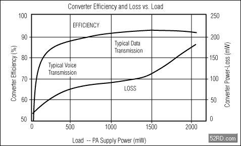 圖3.MAX1820降壓型開關調節器經過優化,在電池消耗最大的情況下發送數據時具有最高的效率。1MHz固定的開關頻率降低了輸出紋波和噪聲,同時在發送話音時能夠保持相對較高的效率和較低的功耗。