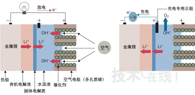 日本產綜研通過將電解液分成兩種解決了這一問題。在負極(金屬鋰)一側使用有機電解液,在正極(空氣)一側使用水性電解液。在兩種電解液之間設置只有鋰離子穿過的固體電解質膜,將兩者隔開(圖8)。這樣便可防止電解液混合,并促進電池發生反應。