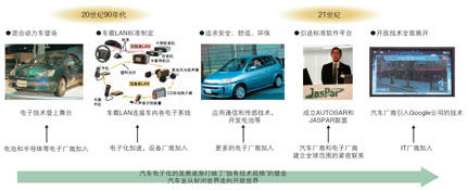 近10年來,從引進CAN車載LAN接口規格到標準化團體的建立,汽車電子化不斷前進,這表明汽車工業正從垂直整合的封閉世界走向水平分工的開放世界。2008年在紐約召開的全球第15屆ITS(智能交通系統)大會上,通用汽車的展臺上出現了Google公司的產品,不少歐洲公司也開始提供Google的地圖服務,日產公司也與Google Maps牽手,提供目的地導航服務。汽車業界的封閉堅冰已經打破,開放匯為潮流。